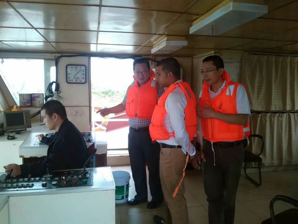 2016年6月28日,孟加拉国农业部副部长拉沙德 .阿科特先生一行在水利部淮河委员会李向东总经理和安徽省水利厅的有关领导陪同下,奔赴我公司在安徽蚌埠淮河浮山段行洪区的施工现场考察,在现场,我公司相关技术人员认真的向阿科特先生介绍了行洪区河道疏浚的施工工艺以及相关技术指标,客人对于鑫岳公司的先进船机设备以及科学的施工工艺表示赞可,并同国家水利部有关专家就两国在航道疏浚、水利项目建设等多方面的合作进行了可行性探讨与交流。(图为:贵宾们实地考察了公司正在施工作业的“玉清九号”绞吸式挖泥船) |